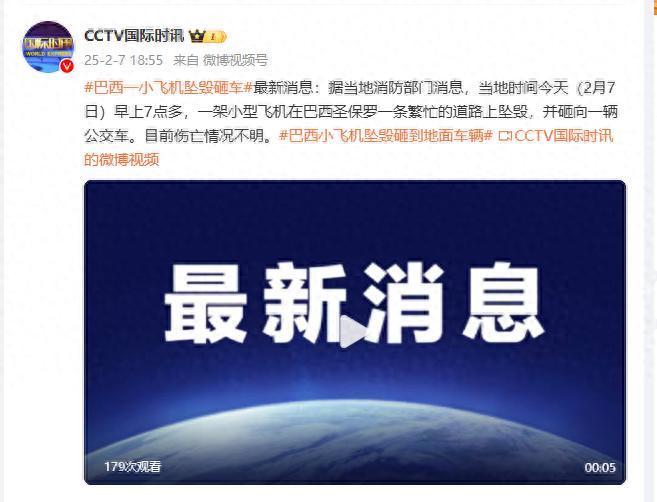最新消息:据当地消防部门消息,当地时间今天(2月7日)早上7点多,一架小型飞机在巴西圣保罗一条繁忙的道路上坠毁,并砸向一辆公交车。目前伤亡情况不明。